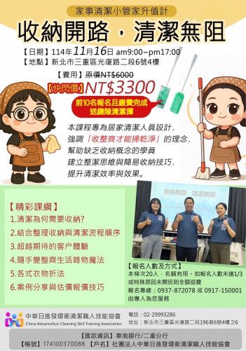 家事清潔小管家升值計 收納開路,清潔無阻 【日期】114年11月16日 am9:00~pm17:0